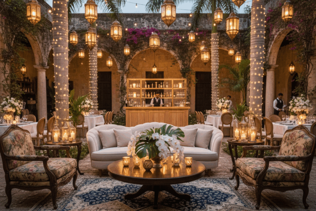 From lush floral arrangements to architectural design, lighting, and furniture, we transform spaces into settings that match your vision.