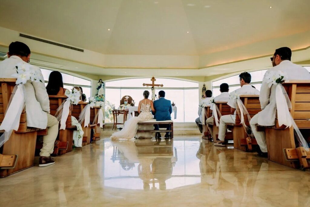 Seaside chapel ceremony, altar decoration, religious music, toast, cake, semi-private reception, breakfast in bed, suite upgrade.