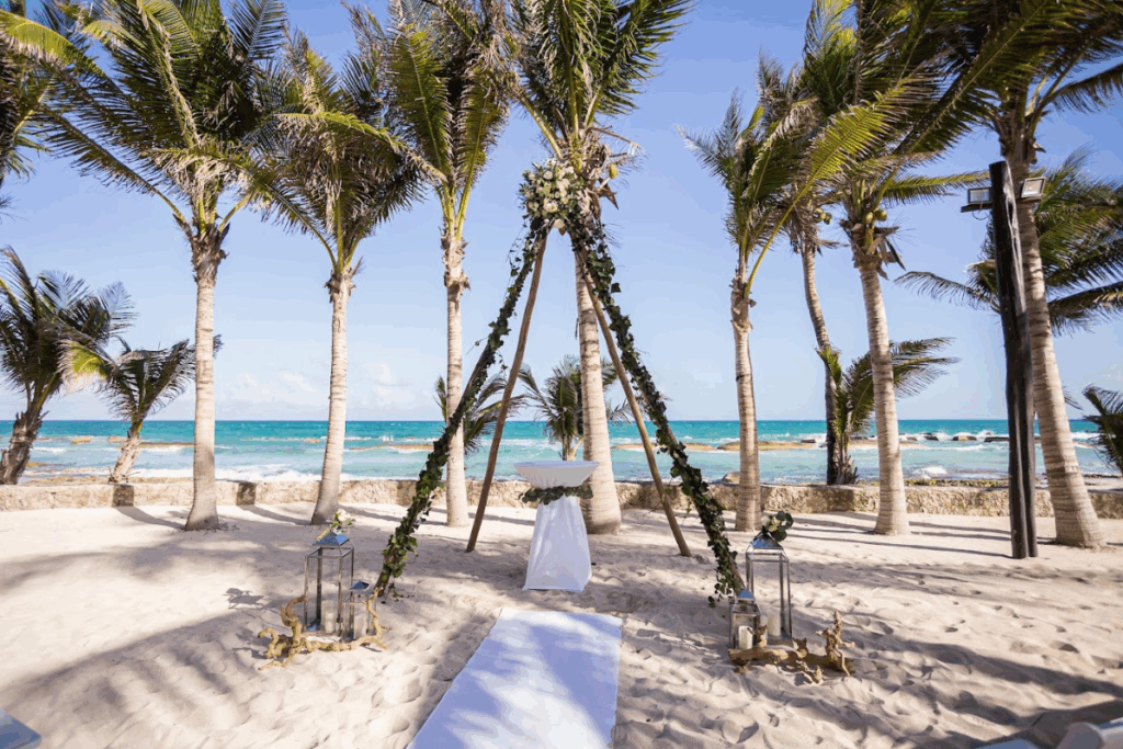 Package for 40 guests in a private garden-style venue. Includes ceremony, music, dinner with the “Taste of Tulum” menu, cake, photos, video, and floral arrangements.